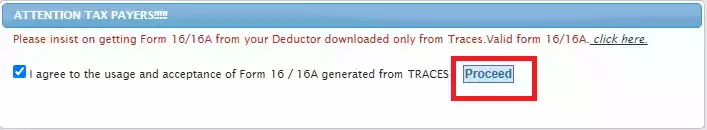 After visiting the TRACES website, a checkbox will appear where you have to accept the disclaimer regarding the use of Form 16/16A. Tick the checkbox there and click on ‘Proceed’.