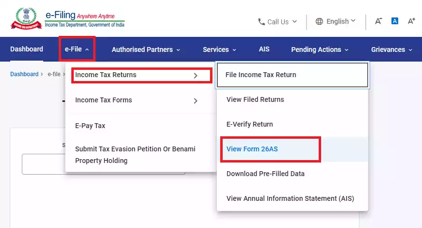 After logging in, you will see a dashboard. There you will see the option ‘e-File’ at the top. Click on it. Then select ‘Income Tax Returns’ from the drop-down menu, and then click on ‘View Form 26AS’.
