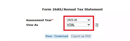 Now select the Assessment Year for which you want to view Form 26AS. For example, if you want to view the form of 2024-25, select it. Then select the format from ‘View As’ – if you want to view it online, select ‘HTML’, and if you want to download, select ‘PDF’.