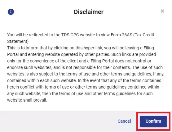 After clicking on ‘View Form 26AS’, you will see a disclaimer. Click on ‘Confirm’ there. Then you will be redirected to the TRACES (TDS Reconciliation Analysis and Correction Enabling System) website.