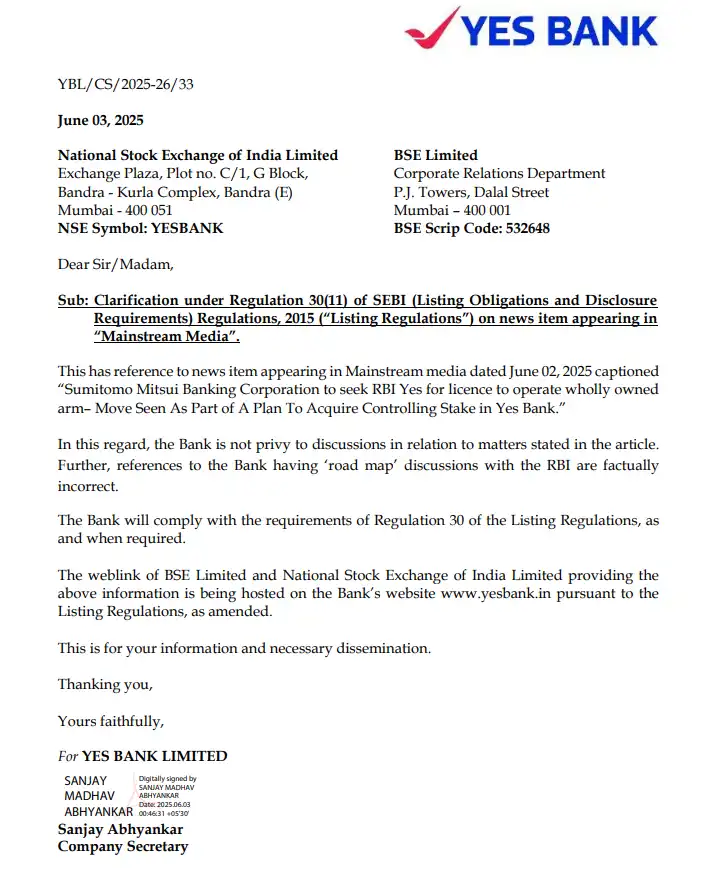 There were reports in the media that SMBC is planning to buy a controlling stake in Yes Bank, and for this, a 'road map' is being discussed with RBI. This news created panic in the market, and investors started selling shares. The result? A huge fall in the share price. But Yes Bank immediately issued a clarification under SEBI regulations, clearly stating that they were unaware of any such discussion. The talks of a 'road map' with RBI were also said to be factually incorrect.